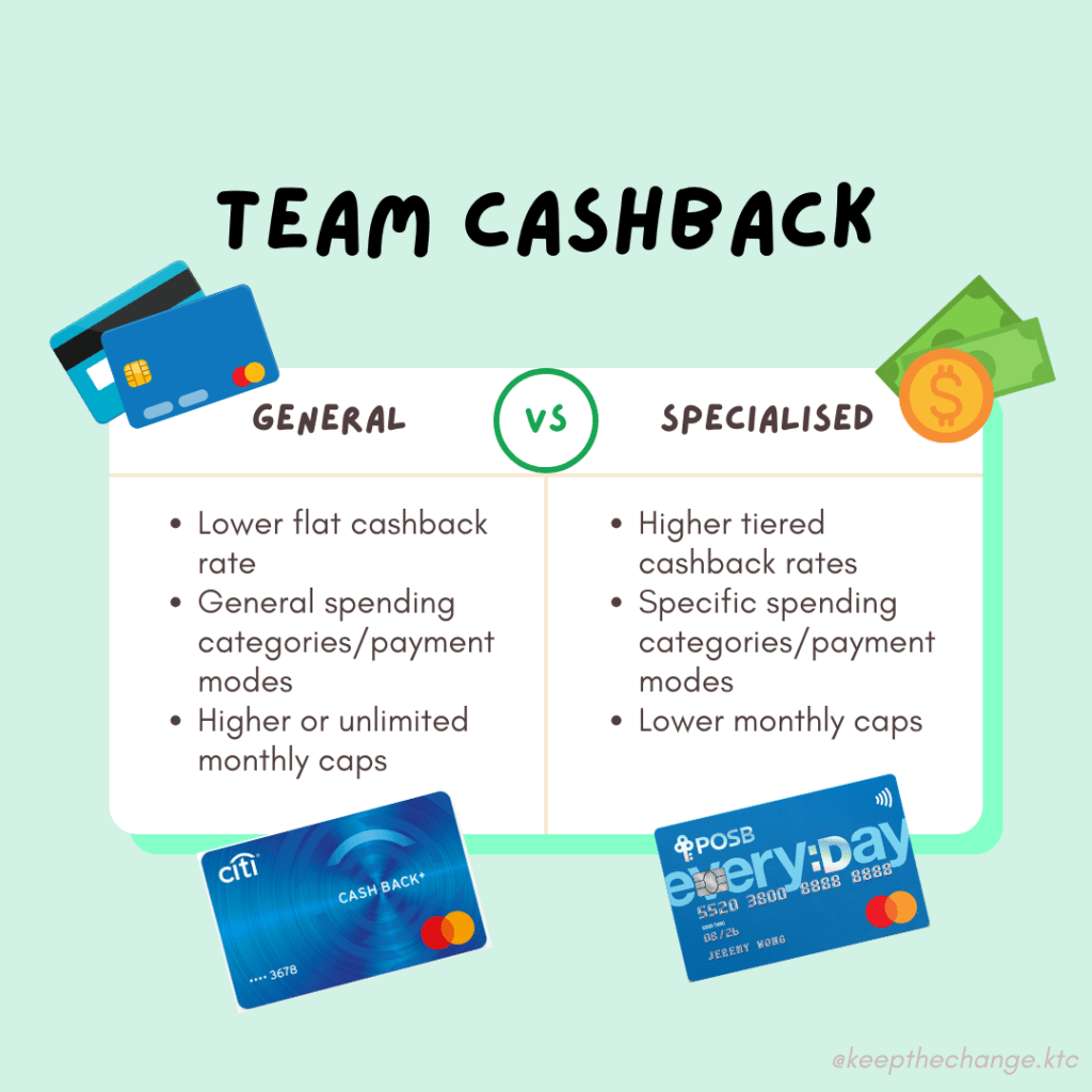 For day-to-day spending in major categories, stick to specialised cards to earn maximum cashback. General cards come in handy if you ever need to make a one-time large payment that exceeds specialised cards’ monthly limits.