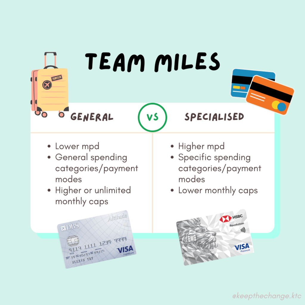 • General – These cards usually offer relatively lower earn rates across a wide range of spending categories, with higher or unlimited caps. For example, the DBS Altitude Card awards you up to 2.2 mpd on overseas spend, and up to 1.3 mpd on local spend, with no limit on the number of miles you can earn in a month.